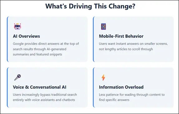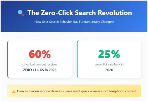 The search pattern of the users has changed. Ranking your content on Google is not enough to bring traffic and conversion to your website. Nearly 60% of the ranked content on Google received zero clicks in 2025, up from less than 25% in 2020. The numbers are even higher on mobile phones, as users are looking for quick answers rather than long-form, keyword-stuffed content that does not address their queries.
